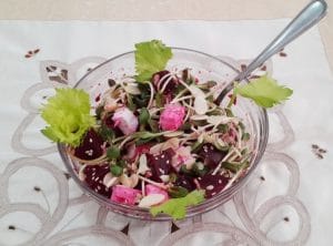 סלט טעים ומפנק שהוא פרווה ולכן מתאים גם לארוחה בשרית. הסלט מהיר הכנה אם אתם שומרים סלק מבושל במקפיא. אנחנו מבשלים במעט מים 6 סלקים בסיר אחד, ואחרי שהתקררו אורזים כל שניים בשקית להקפאה. מפשירים בהפשרה איטית במקרר יומיים לפני השימוש. במקום לקלף כל סלק קיצרנו תהליכים- משפשפים אותם עם סקוטשברייט חדש ורוב הקליפה פשוט נעלמת.