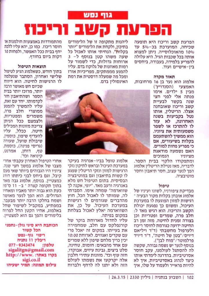 אלמוג טופל בביו-אנרגיה בעיקר במערכת העיכול ובראש לתיקון נזקי הרגישות למזון ונזקי הריטלין שפגע לו קשות בתיאבון וגם במוטיבציה הבסיסית. בתום הטיפול חש מלא באנרגיה ורעב מאד. "יופי, אקנה לך שווארמה" שמחה אימו. הסברתי לה, שמותר לו לאכול הכל, חוץ מהדברים שגורמים לו רגישות במערכת העיכול. על כן, את השווארמה יאלץ לאכול בצלחת במקום בפיתה.