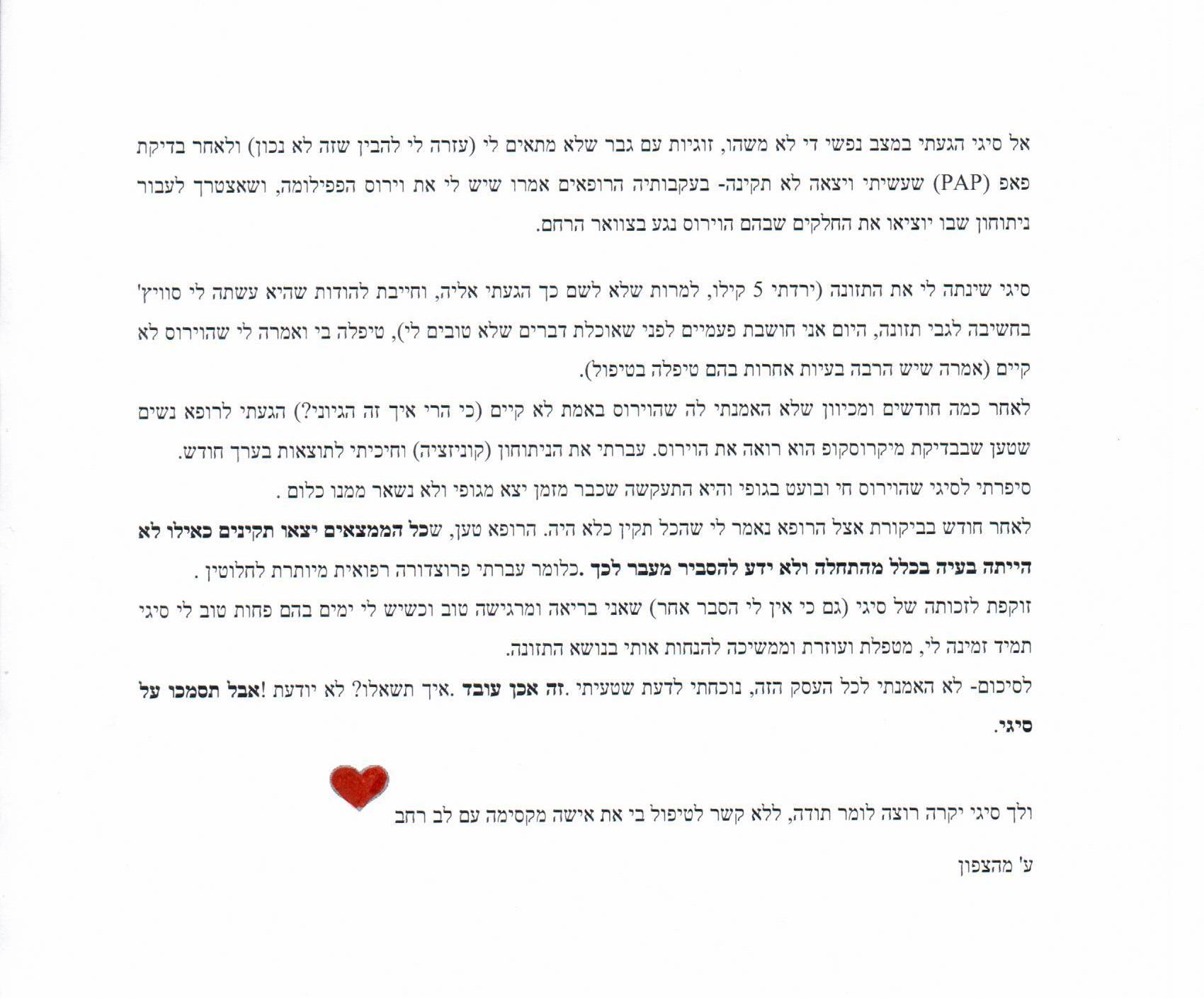 אל סיגי הגעתי במצב נפשי די לא משהו, זוגיות עם גבר שלא מתאים לי (עזרה לי להבין שזה לא נכון) ולאחר בדיקת פאפ (PAP) שעשיתי ויצאה לא תקינה- בעקבותיה הרופאים אמרו שיש לי את וירוס הפפילומה, ושאצטרך לעבור ניתוחון שבו יוציאו את החלקים שבהם הוירוס נגע בצוואר הרחם.