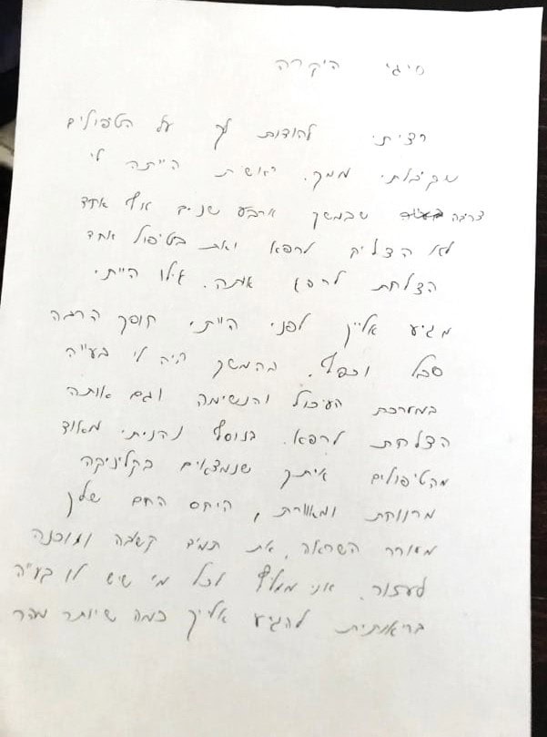 א' הגיע אלי מת"א עם מצוקה וסבל של צריבה בשתן מזה כמה שנים. במהלך שנים אלה ניסה לפתור את הבעיה בדרכים שונות כולל בחוץ לארץ, כולל לקיחת אנטיביוטיקה בכמויות אדירות. לדבריו, שילם 500,000 ש"ח בניסיונותיו להתרפא. כבר בטיפול הראשון נעלמה הצריבה. לכן כתב לי מכתב תודה:
