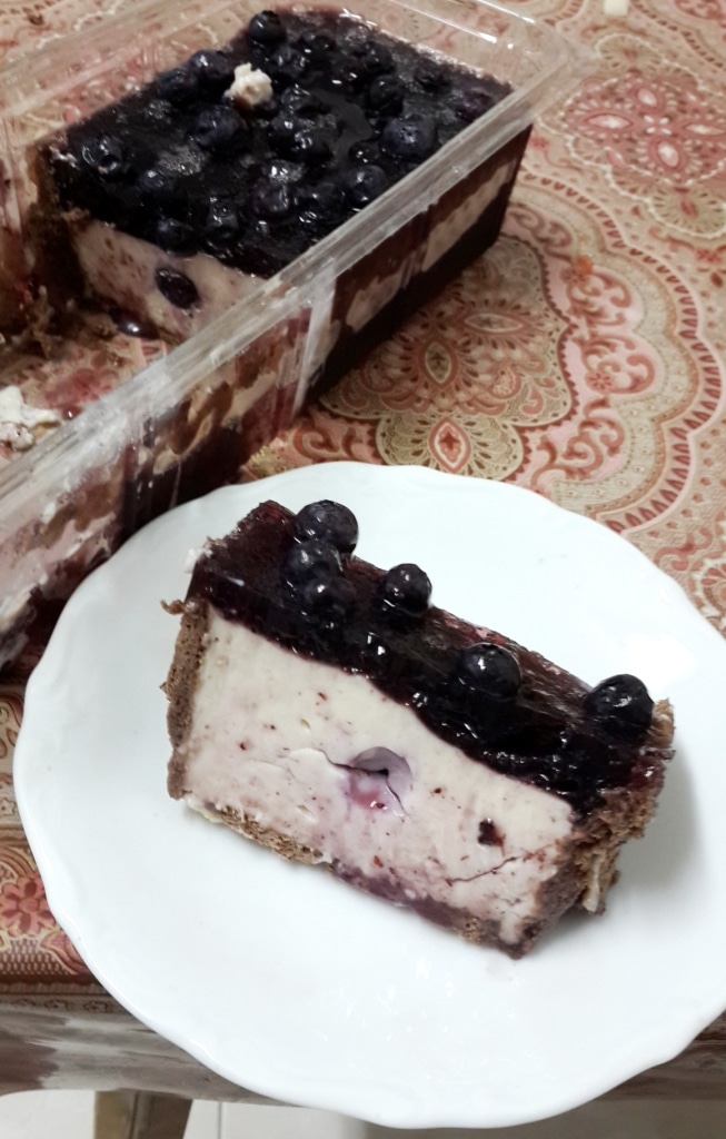 מערבבים בזילוף מהיר תוך כדי בחישה את הג'לטין לתוך המים הרותחים עד שמתמוסס לגמרי. מחכים שיתקרר לטמפרטורת החדר ובינתיים מרפדים תבנית מלבנית של אינליש קייק בשכבת פתי בר גם בצדדים. אין צורך לרסק. כשמי הג'לטין התקררו מערבבים במערבל את הפודינג עם 2 גביעי גבינה + 1 סוכר וניל + גרד קליפת לימון. מוסיפים חצי ממי הג'לטין וממשיכים לבחוש במהירות נמוכה ואז גבוהה. שופכים חצי מהתערובת על הפתי בר שבתבנית. מסדרים בשורה במרכז העוגה לכל אורכה אוכמניות טריות או קפואות שהופשרו ואז מכסים עם המחצית השניה של התערובת. מכניסים למקרר ל- 10 דקות לפחות. בינתיים מערבבים היטב את הריבה המים בטמפרטורת החדר ומי הג'לטין בקערה. מוסיפים את האוכמניות הטריות או הקפואות ומערבבים ערבוב קצר ביותר. שופכים את התערובת על הפודינג שבתבנית בצורה אחידה ככל הניתן ומתקבל ציפוי של ג'לי כהה וכמעט שחור מעל לעוגה. מכניסים למקרר לפחות ל- 5 שעות. פורסים ונהנים.