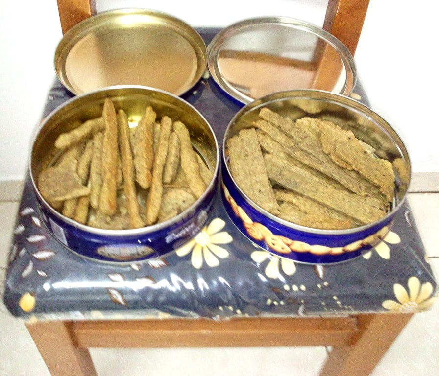 כשהבצק משחים מעט הקרקרים מוכנים. הם ממלאים 3 קופסאות פח של עוגיות דניות. בתמונה לעיל יש רק שתי קופסאות. למה? כי רבים מהקרקרים כלל לא הספיקו להגיע למצב של אחסון, שכן נטרפו ישירות מהתבנית וגם נשלחו למכרים רעבים שחיכו להם.