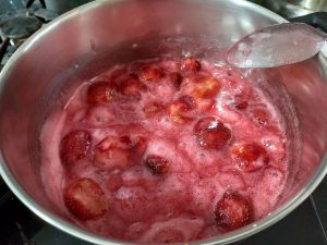 בוחשים שלא יהיו גושים. מבשלים תוך כדי בחישה על אש גבוהה ואז מנמיכים אחרי בעבוע. מוסיפים את התותים (כמה? בערך 15 עד 30).