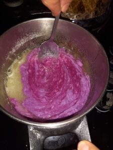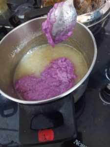 לערבב בכוס את מיצוי הבטטות עם הקמח עד שאין גושים, ולהוסיף לתערובת שבסיר תוך בחישה מתמדת. אמנם המיצוי סגול אבל בערבוב עם שאר החומרים הופך לוורוד משגע.