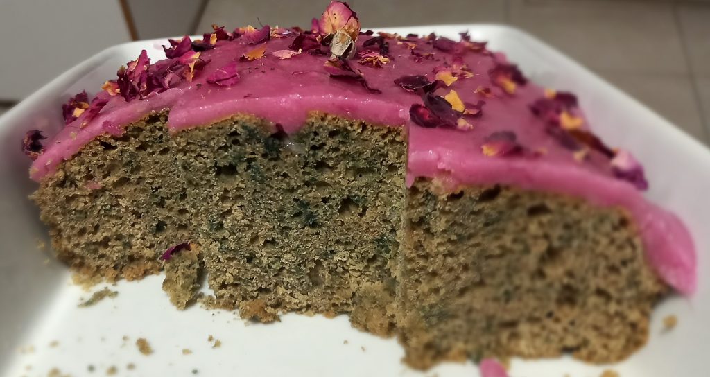 על אף היותי פרסיה מבטן ומלידה מעולם לא שמעתי על עוגת אהבה פרסית. בעיתון 'לאשה' התפרסם לאחרונה מתכון וקרובת משפחה ביקשה שאכין לה. המתכון היה חלבי ועם גלוטן ונדרש להתאמות מיוחדות. הנה התוצאה לפניכם. הצבע הירוק נובע מאפיית זרעי החמנייה והדלעת ומזכיר את מתכון העוגה הירוקה באתר זה. העוגה היא פרווה, עם שמן קוקוס במקום חמאה, ללא גלוטן וללא צבע מאכל (צבע ורוד הושג ממיצוי של בטטות סגולות). מעבר ליופיה ולצבעוניותה היא מאד טעימה והבצק שלה מאד מזין, כי מכיל קמח אורז מלא וזרעים טחונים של חמנייה ודלעת. העוגה תופחת מאד ובמרכזה נוצר שבר סורי-אפריקאי חינני. אל דאגה- הציפוי יכסה אותו.
