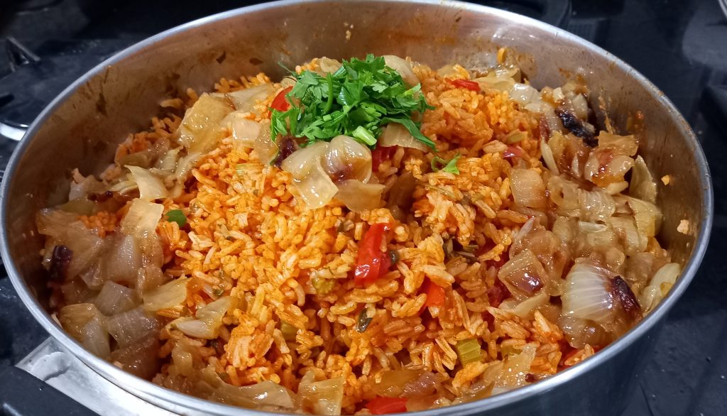 מרתיחים במים את כל הירקות, כולל שליש מהבצל המטוגן אם יש, כולל הקטשופ, למעט עשבי התיבול. לאחר רתיחה מוסיפים אורז אחרי ששטפנו אותו היטב כמה פעמים ומביאים לרתיחה. מוסיפים תבלינים בוחשים קלות ומנמיכים את האש. מדי פעם בוחשים קלות. כשהאורז כמעט מוכן לזלף מלמעלה רבע כוס שמן זית. אפשר להקפיץ את האורז עם מזלג בשלב זה ולא רצוי לבחוש כי עלול להפוך לדייסתי. כשהאורז מוכן ורך לכבות גז ולהשאיר סיר סגור לעוד 10 דקות. לפזר מעל את שארית הבצל המטוגן ומעט עשבי תיבול טריים קצוצים.