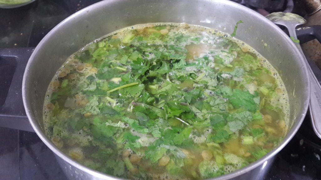 מטגנים בסיר גדול ועמוק את הבצל בשמן עד להזהבה מוסיפים את השום ומטגנים עוד כמה דק' עד להזהבתו. מוציאים לקערה. שמים בסיר את המים והעדשים הירוקות. לאחר בעבוע שוטפים עדשים אדומות ומוסיפים. מדי פעם בוחשים. מערבבים את הקמח חצי כוס מים עד להיעלמות הגושים. שופכים לסיר ובוחשים. קוצצים את כל העשבים דק ומוסיפים לסיר עם התבלינים. כשהעדשים התרככו כולל האדומות זה הזמן להוסיף אטריות אורז רחבות למי שרוצה. לבשל על אש קטנה 5 דקות, לכבות את הגז והאיטריות ממשיכיות להתנפח ולהתרכך. לפתוח מכסה אחרי כ- 10 דקות. קחו בחשבון, שאם מוסיפים חבילה שלמה היא די "שותה" את נוזלי המרק… מתקבל תרביח של עדשים ואטריות ללא זכר למרק. מוסיפים בערך כף בצל ושום מטוגנים לקערית של כל סועד ומתענגים על הטעם.